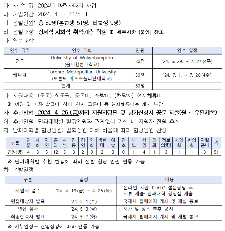 2024년 파란사다리 사업 참여학생 모집 안내(※영국 울버햄튼대학교, 캐나다 토론토 메트로폴리탄대학교)