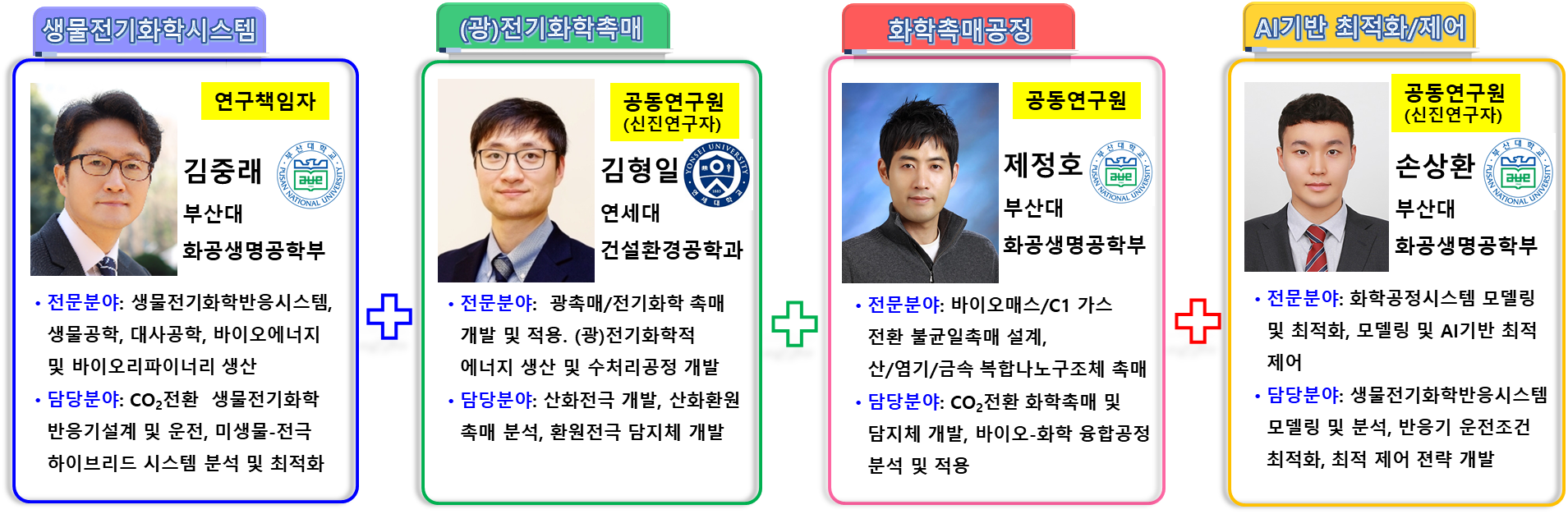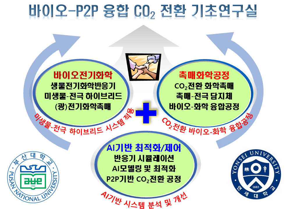 우리 연구실은 "신재생 전기에너지를 환원력으로 활용하는 Power to Product (P2P) 기술을 통해 온실가스인 CO₂를 고부가화학물질로 전환하는 바이오-화학 융합촉매 기술과 공정을 개발할 계획입니다. 본 과제 수행을 위해 우리 학과 제정호, 손상환 교수님, 연세대 김형일 교수님과 공동연구를 수행할 예정입니다.