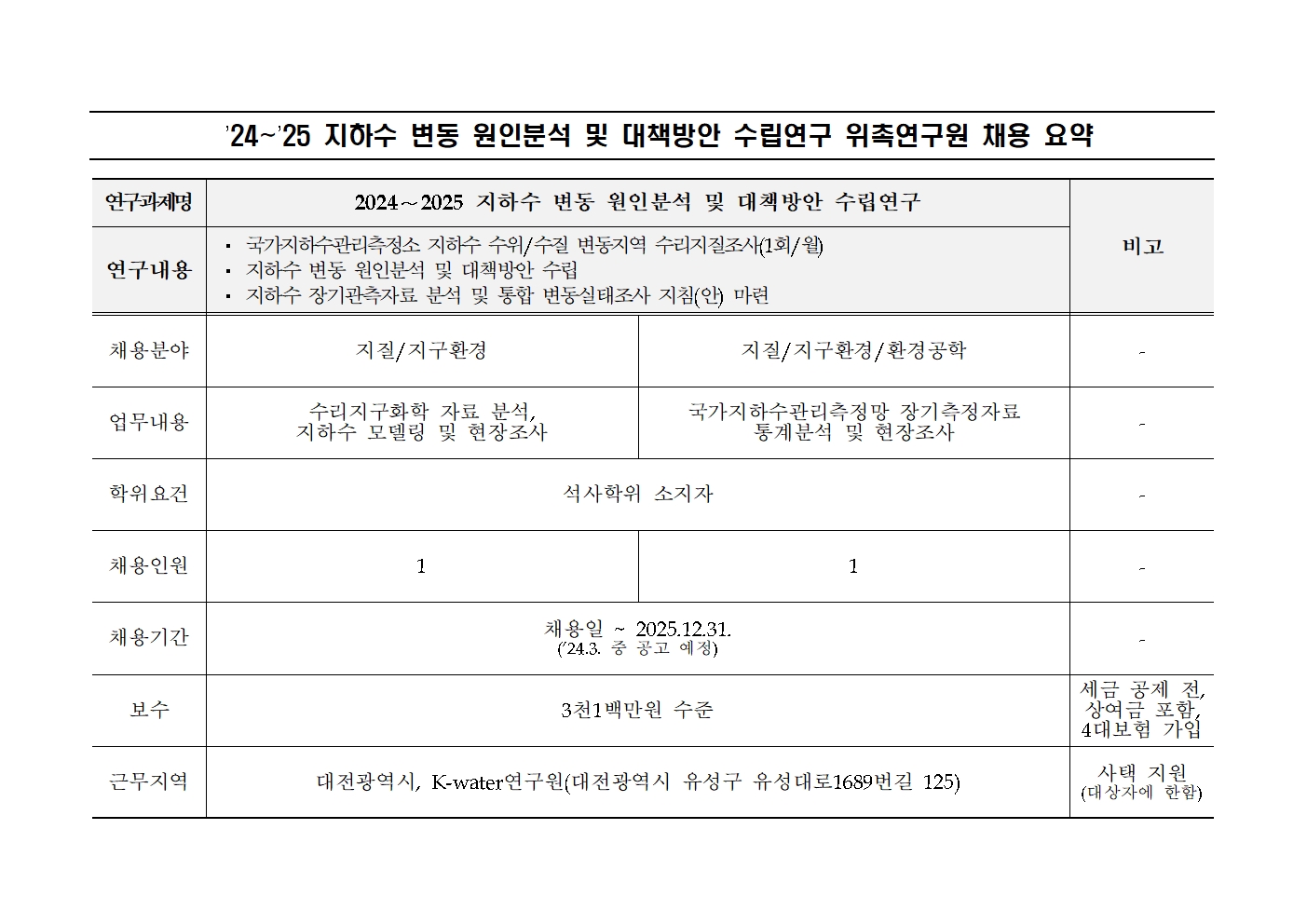 ㅇ 근무장소: K-water연구원(대전광역시 유성구 유성대로 1689번길 125)