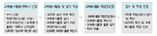 ※ 단순노무, 사무보조, 행사진행, 인솔, 감독, 도서대출·반납, 교재교구 준비 등은교육봉사활동 이수로 인정하지 않음