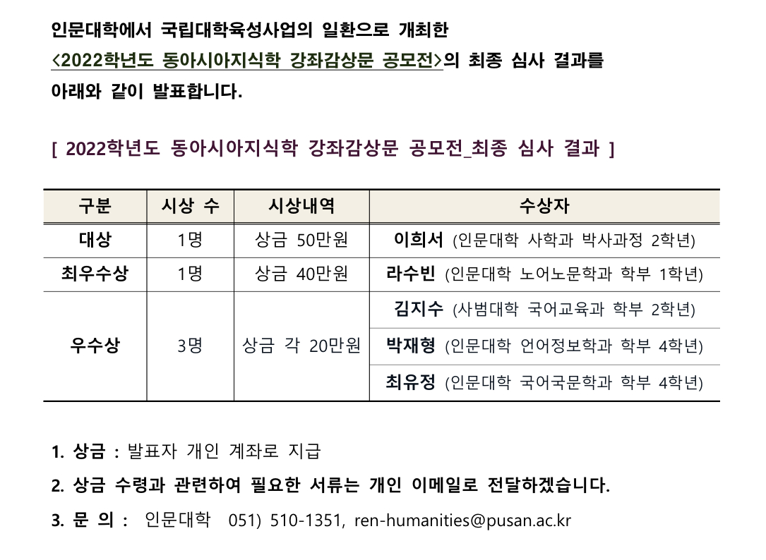 [REN_인문대학] 2022학년도 동아시아지식학 강좌감상문 공모전_심사 결과 발표