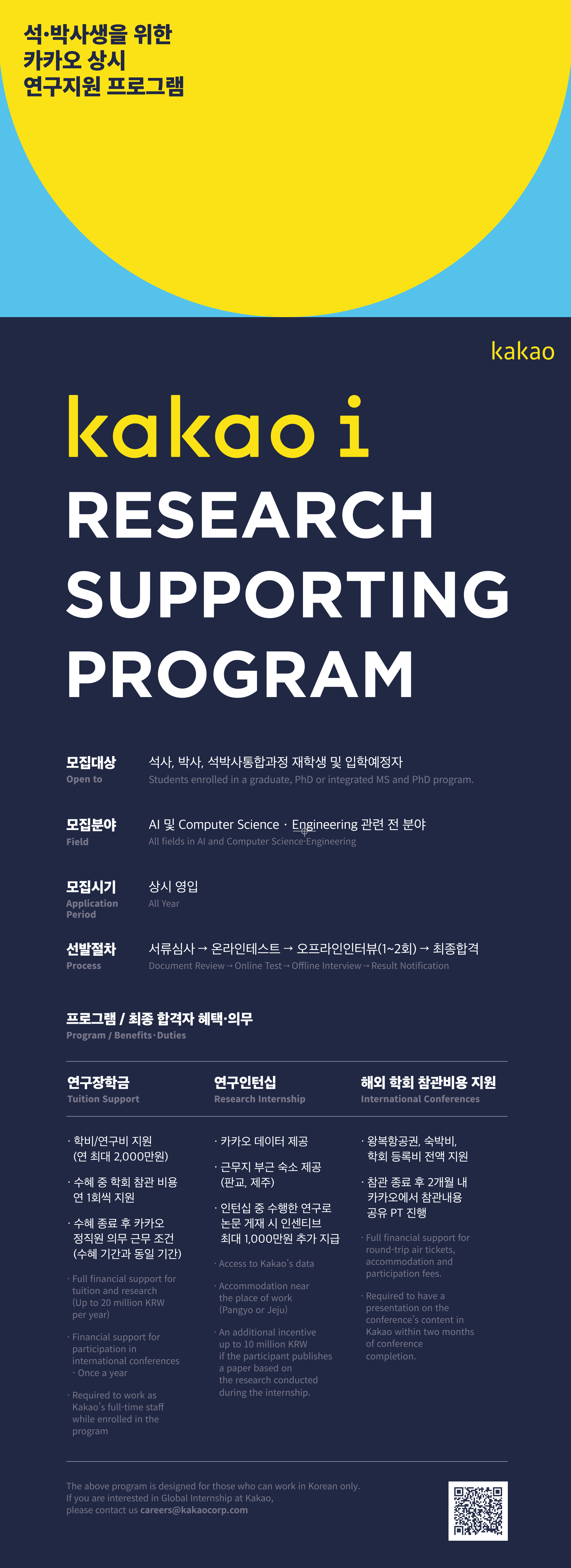 Kakao I 에서 2018 석,박사,석/박사통합과정을 위한 상시 연구지원 프로그램