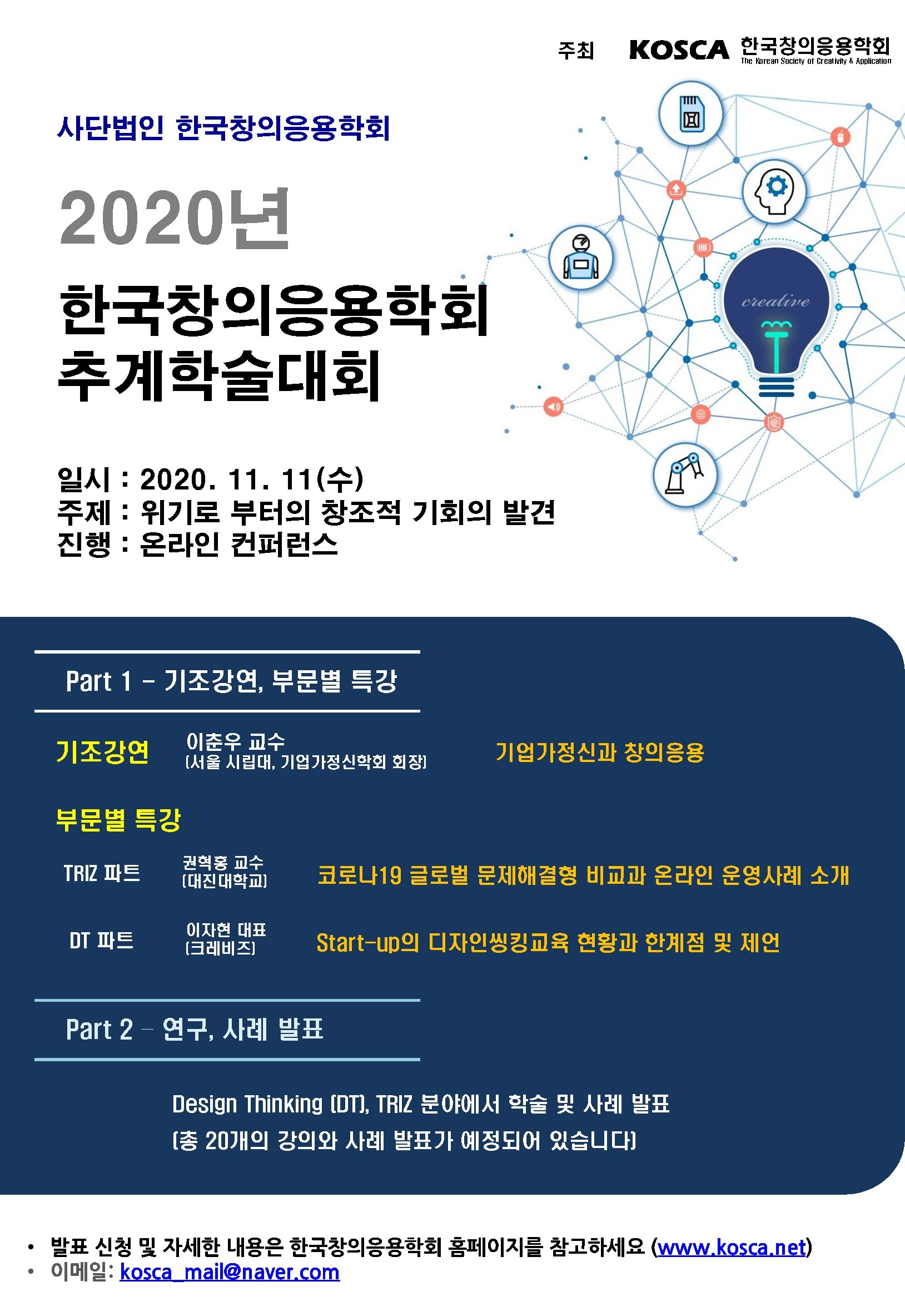 금년에는 코로나19로 인한 국가적인 어려움을 타개하고 이를 새로운 기회로 만들고자 “위기로부터 창조적 기회의 발견” 이라는 주제로 2020년도 추계 학술대회가 11월 11일 온라인으로 개최됩니다.