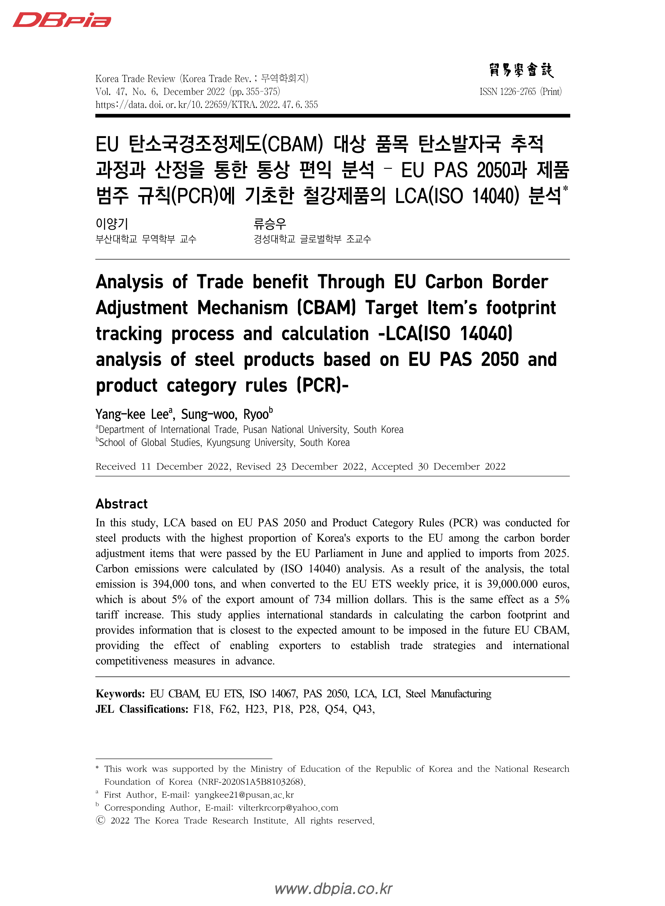 영 문 | Analysis of Trade benefit Through EU Carbon Border Adjustment Mechanism (CBAM) Target Item’s footprint tracking process and calculation -LCA(ISO 14040) analysis of steel products based on EU PAS 2050 and product category rules (PCR)- | |||