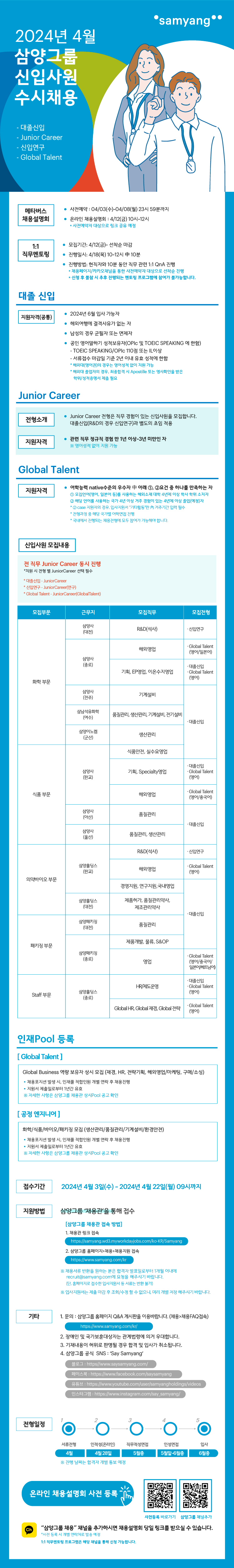 Global Business역량 보유자 상시 모집(재경, HR, 전략기획, 해외영업/마케팅, 구매/소싱) *채용 포지션 발생 시, 인재풀 적합인원 개별 연락 후 채용진행 *지원서 제출일로부터 1년간 유효 ※ 자세한 내용은 삼양그룹 채용관 상시 Pool 공고 확인 |