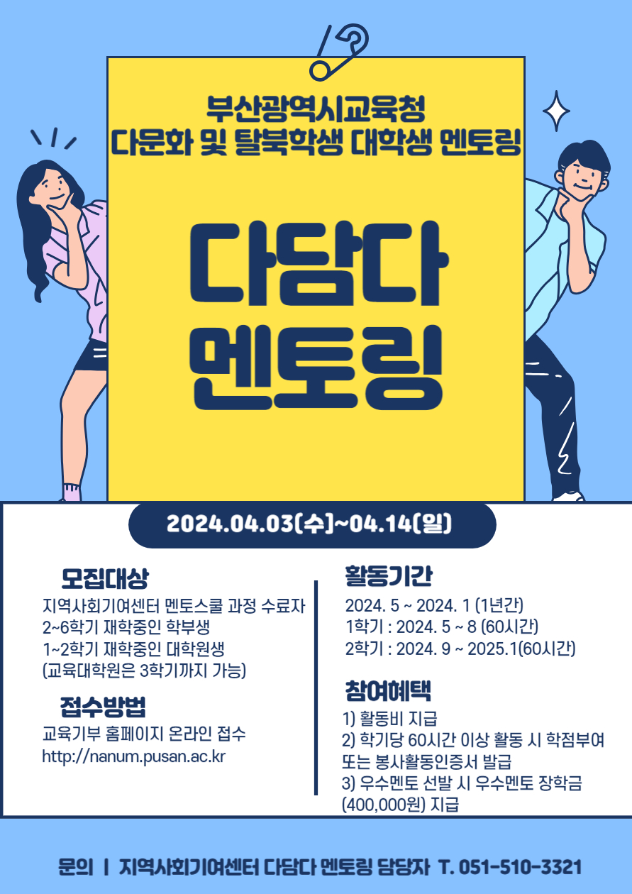 다. 모집대상 : 부산대학교 학부생 중 지역사회기여센터에서 개설한 멘토스쿨 수료자 전원