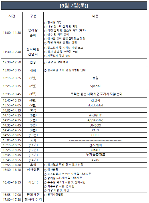 ★ 발표심사 및 시상식은 팀원 모두가 발표시간과 관계없이 `19.9.7(토) 12:40 까지 본관 대회의실 3층에 출석하셔야 합니다.