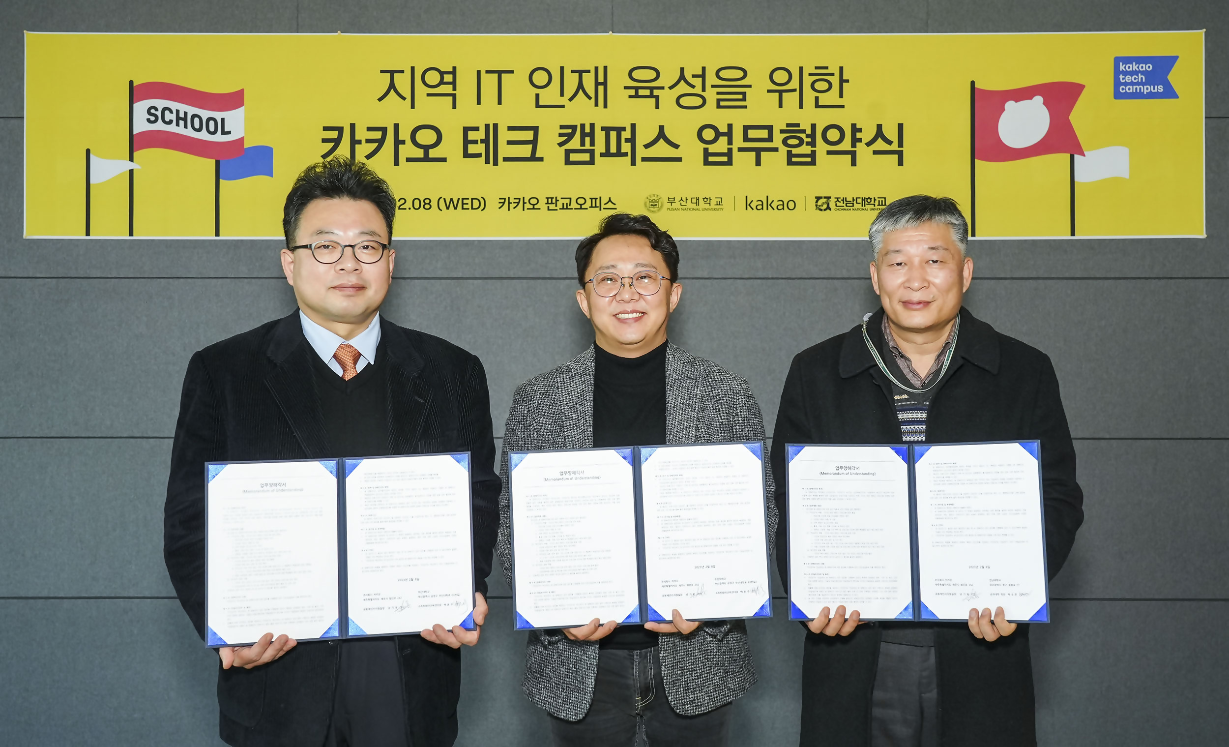 □ 국가거점국립대학인 부산대학교(총장 차정인)는 카카오(대표이사 홍은택) 및 전남대학교와 ‘카카오 테크 캠퍼스’ 운영을 위한 업무협약(MOU)을 8일 오후 카카오 판교 아지트에서 체결했다
