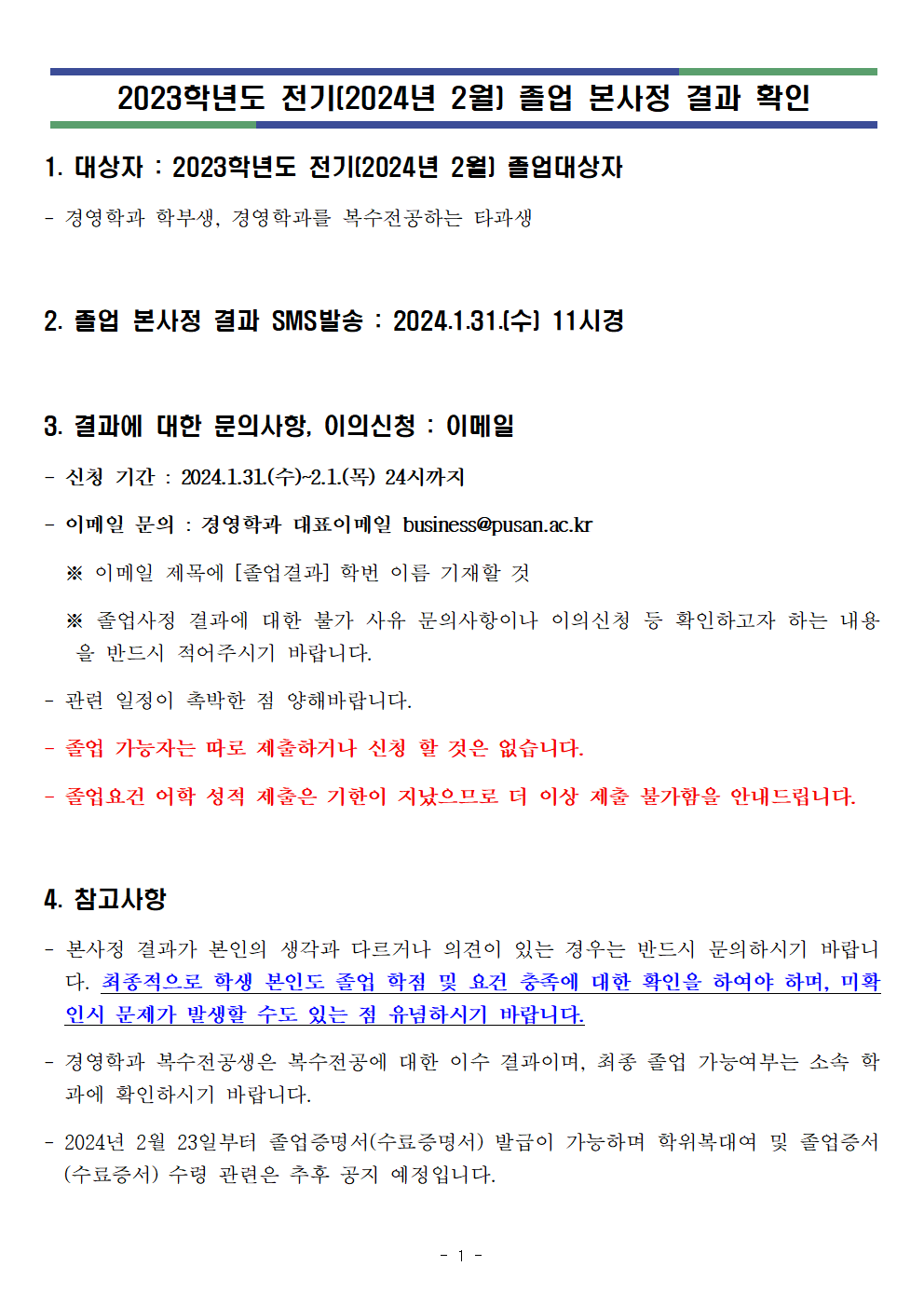 [졸업] 2023학년도 전기(2024년 2월) 졸업 본사정 결과 확인(~2/1)