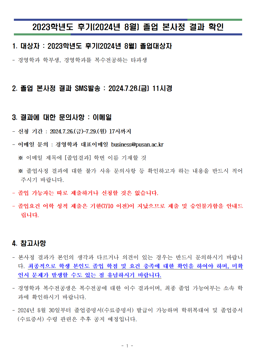 2023학년도 후기(2024년 8월) 졸업 본사정 결과 확인