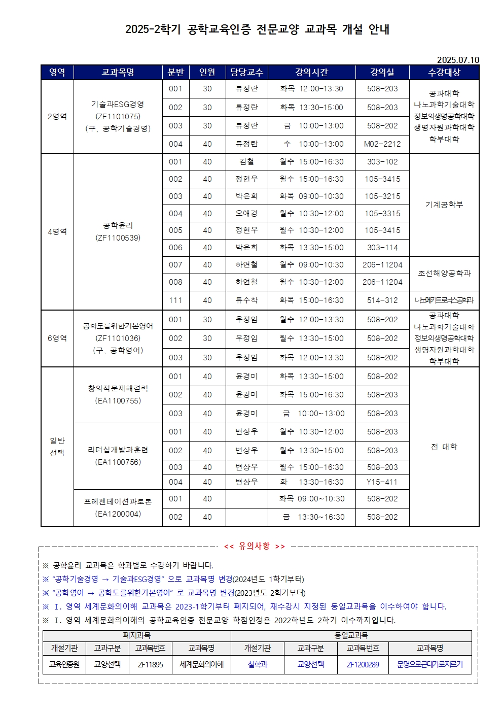 2025-2학기 공학교육인증 전문교양 교과목 개설 안내