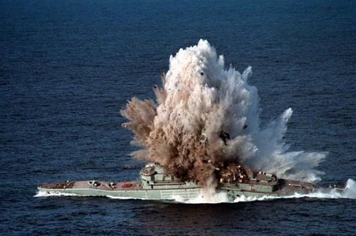 ◇해상군사훈련 도중 표적 역할을 하는 퇴역 함정이 어뢰에 맞아 두 동강 나는 모습.