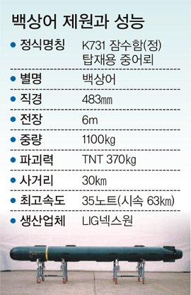 백상어는 잠수함과 잠수정에 탑재해 수상함과 잠수함, 수송선단을 공격하는 ‘중어뢰급’으로 개발됐다.