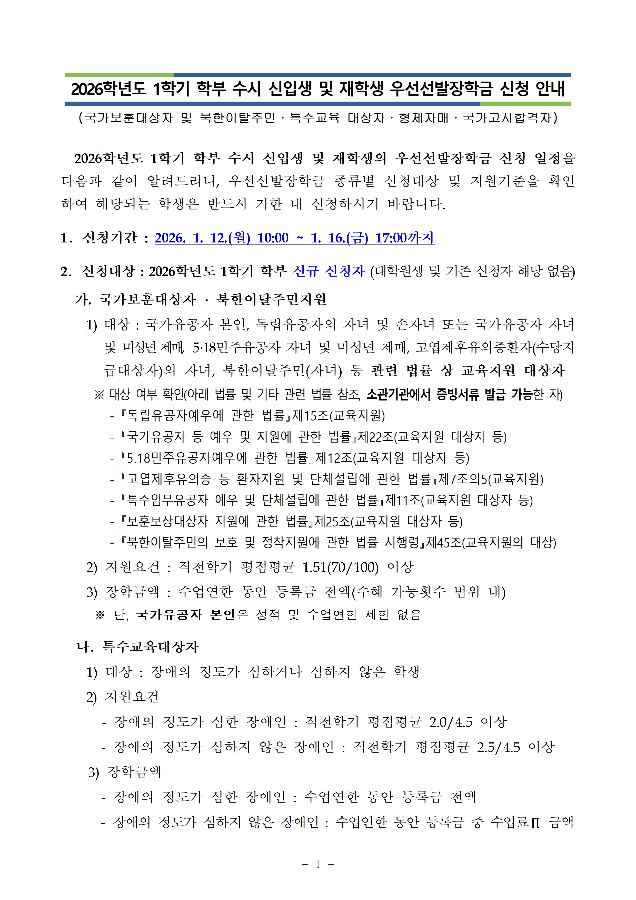 [2026학년도 1학기] 학부 등록금재원 우선선발장학금 신청 안내