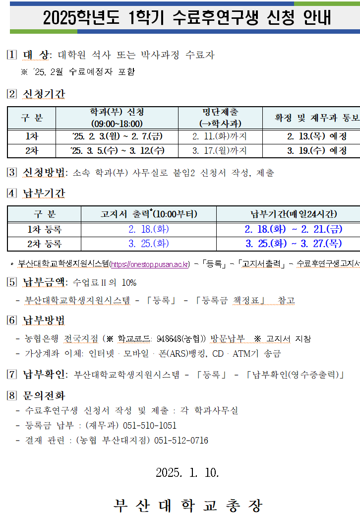 *To print the bill: Pusan National University Student Support System (https://onestop.pusan.ac.kr) - "Registration" - "Print Bill" - Post-Completion Researcher Bill