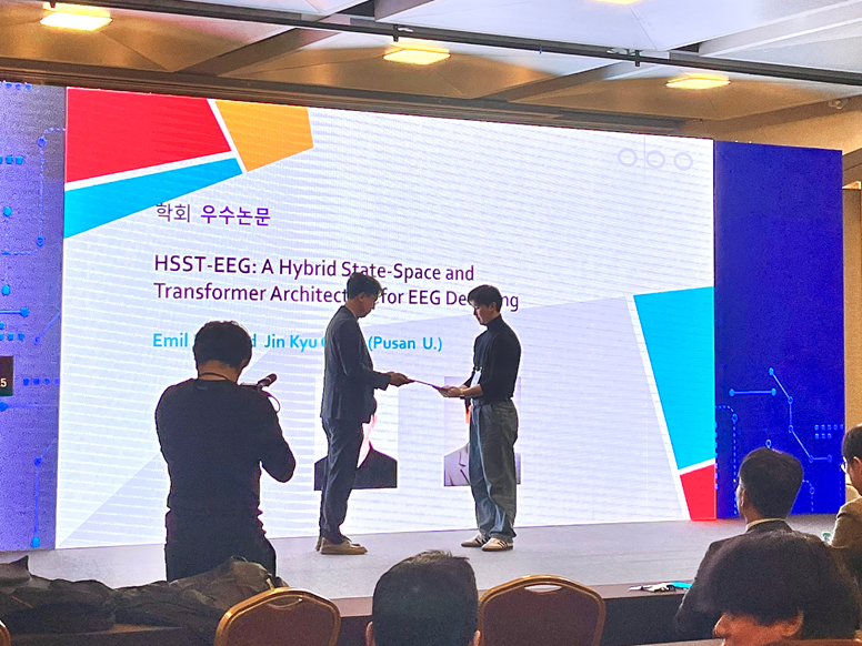 감진규 교수 연구실(IC&ML) 소속 김에밀 연구원이 25년 11월 20일 개최된 (사)한국인공지능학회(The Korean Association for Artificial Intelligence, KAAI https://aiassociation.kr/) 2025 추계학술대회에서 우수논문상을 수상하는 영예를 안았다. 김에밀 연구원(AI전공 석박사통합과정)은 감진규 교수의 지도 아래, 뇌파(EEG) 신호 해독의 정확성과 효율성을 향상시키기 위한 딥러닝 모델 연구 성과를 담은 “HSST-EEG: A Hybrid State-Space and Transformer Architecture for EEG Decoding”을 발표했다.