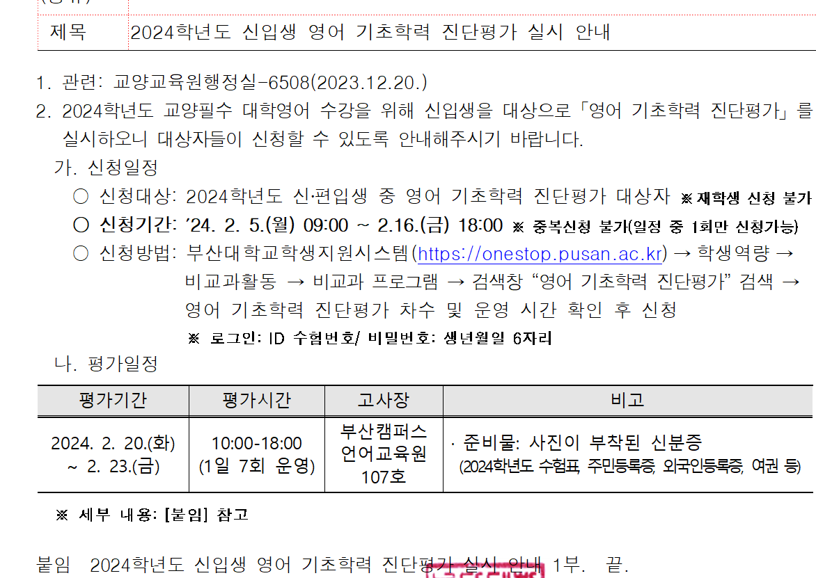 2024학년도 신입생 영어 기초학력 진단평가 실시 안내