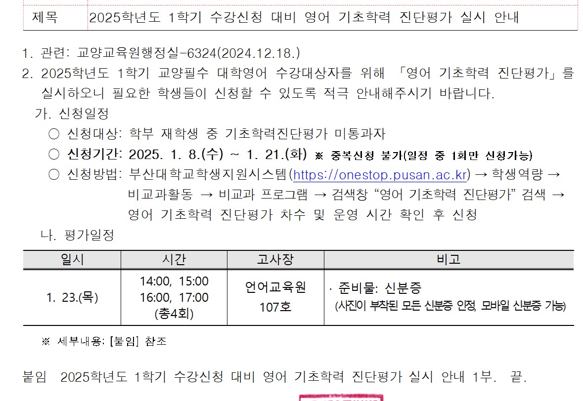 2025학년도 1학기 수강신청 대비 영어기초학력 진단평가 실시 안내