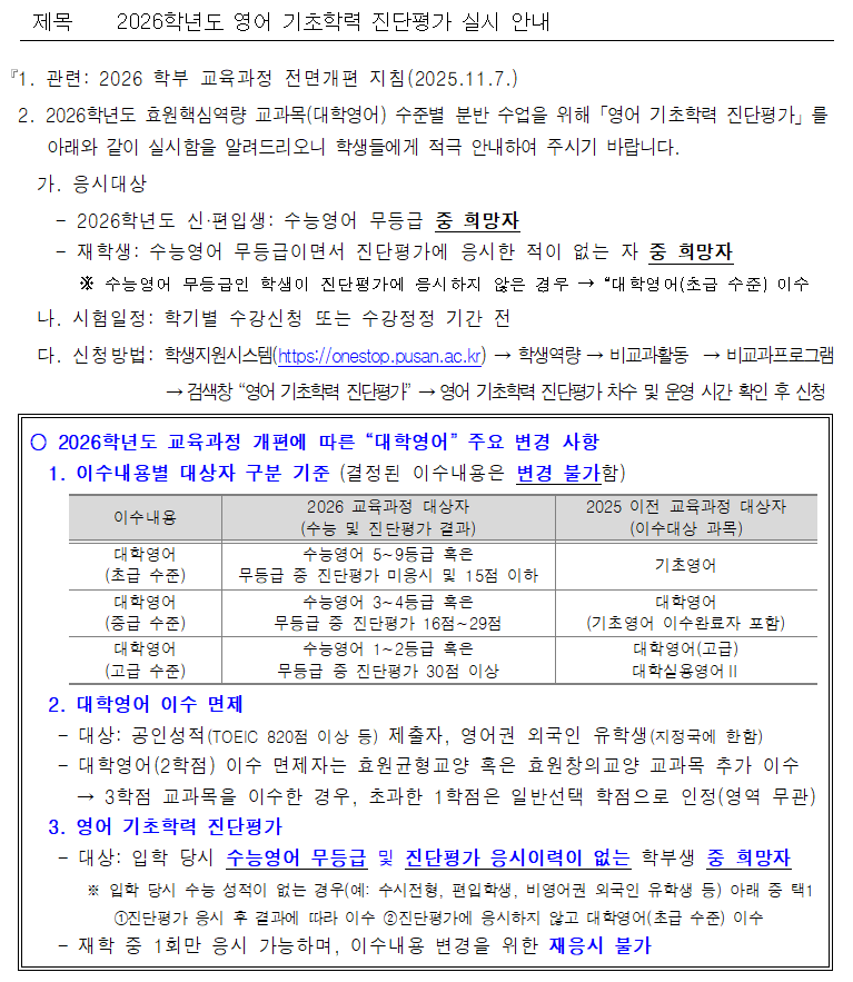 2026학년도 영어 기초학력 진단평가 실시 안내