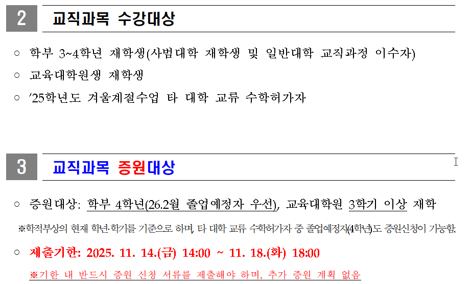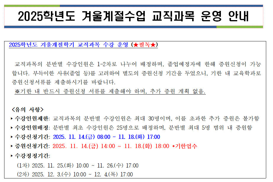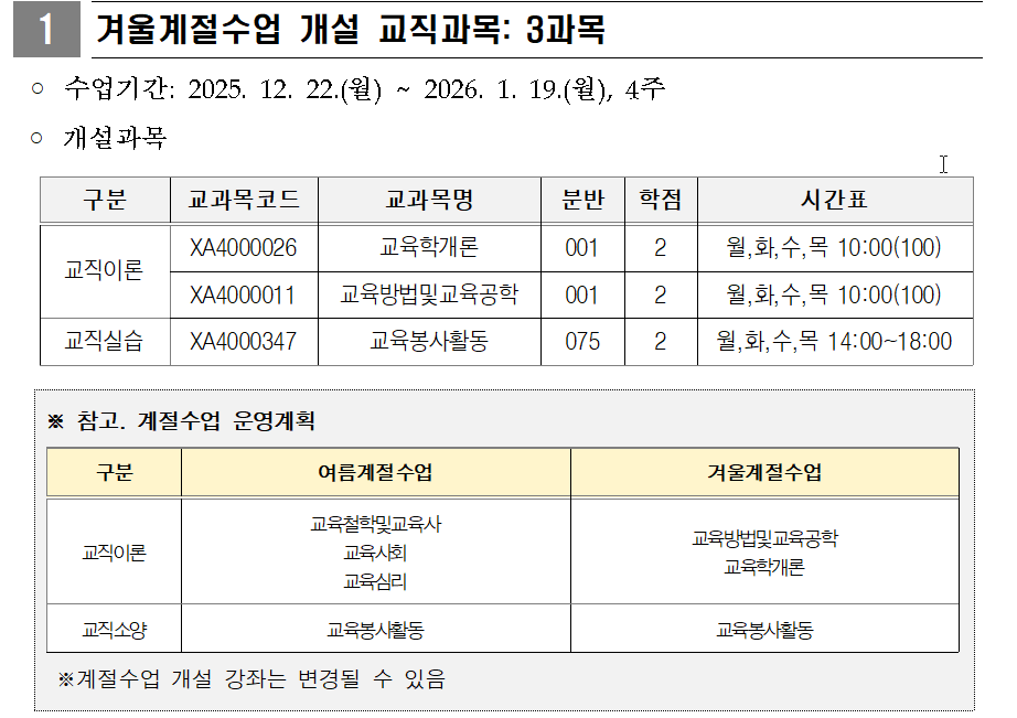 붙임1. 2025학년도 겨울계절학기 교직과목 수강안내(배포용).hwp