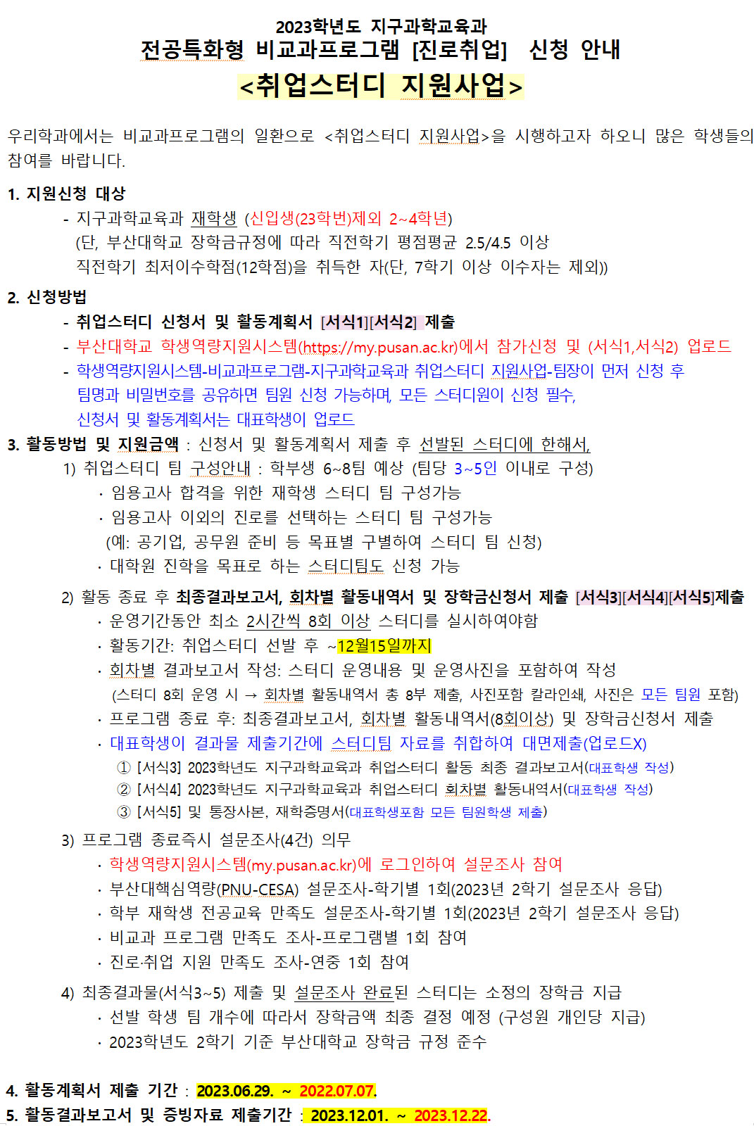 2023학년도 지구과학교육과 취업스터디 지원사업(2~4학년) 안내