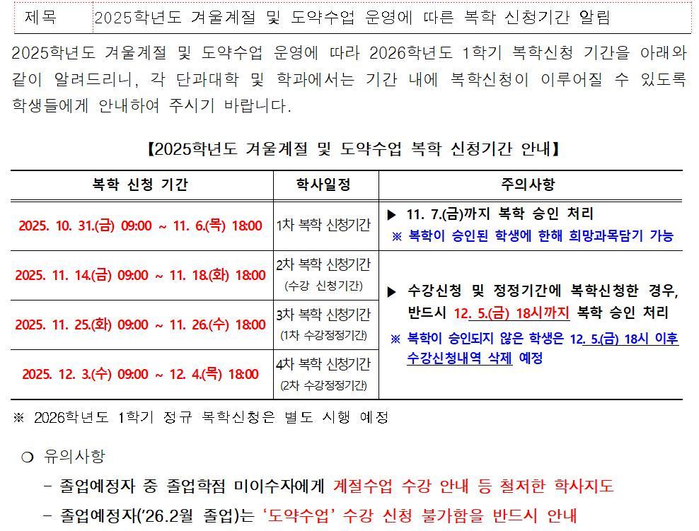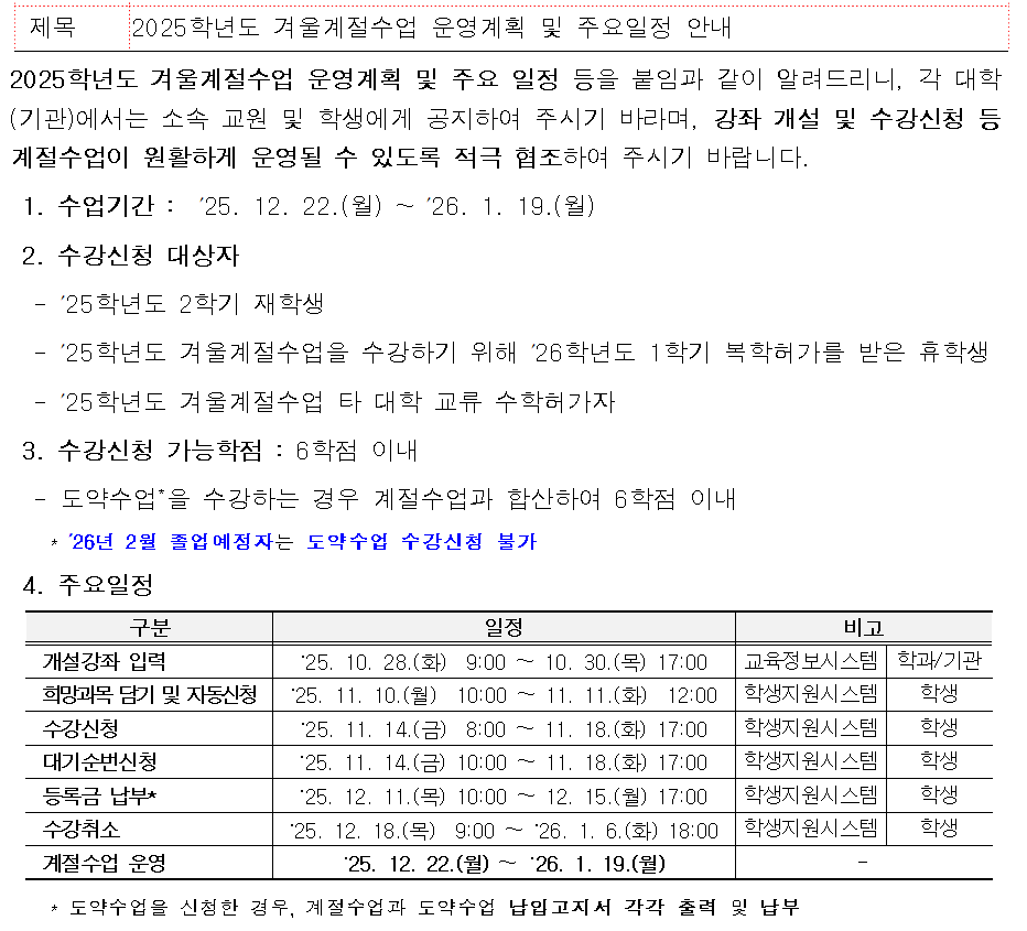 2025학년도 겨울계절수업 및 복학안내 안내입니다