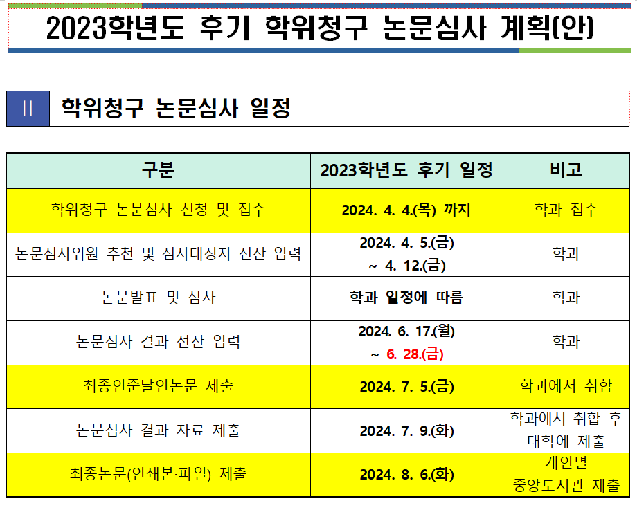 2023학년도 후기 학위청구논문 심사 계획 알림(2024년 8월 졸업)