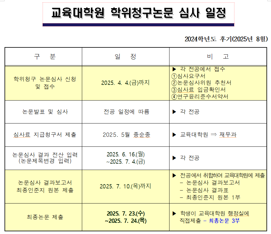 2024학년도 후기(2025년도 8월) 교육대학원 학위청구논문 심사계획 알림