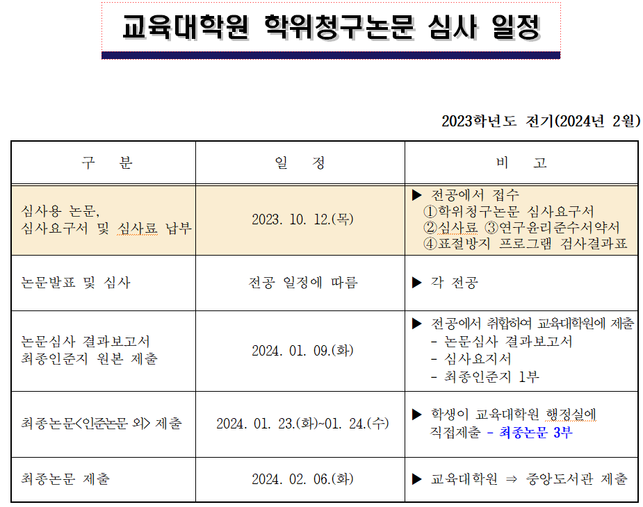 2023학년도 전기 교육대학원 학위청구논문 심사계획 알림