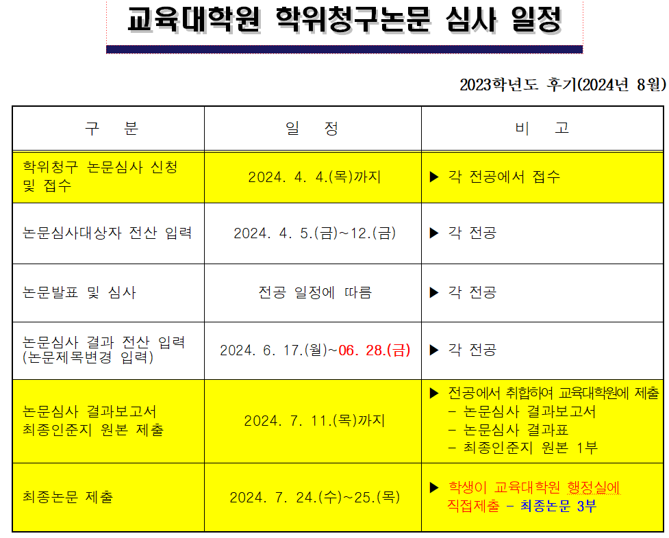 2023학년도 후기(2024.8월 졸업) 교육대학원 학위청구논문 심사계획