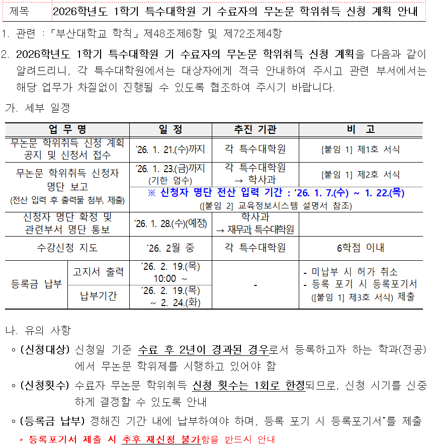 2026학년도 1학기 특수대학원 기 수료자의 무논문 학위취득 신청 계획 안내