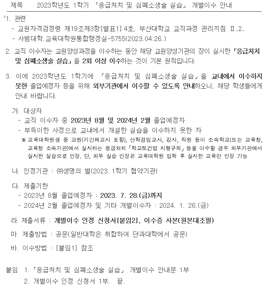 2023학년도 1학기 「응급처치 및 심폐소생술 실습」 개별이수 안내
