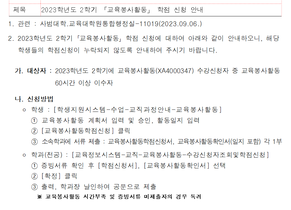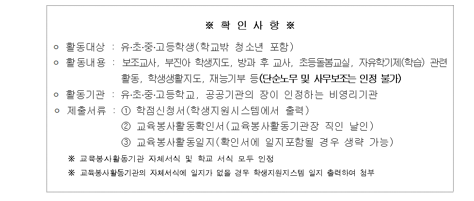 -제출서류 : 교육봉사활동학점인정신청서, 교육봉사활동확인서, 교육봉사활동일지(점심시간 포함X)