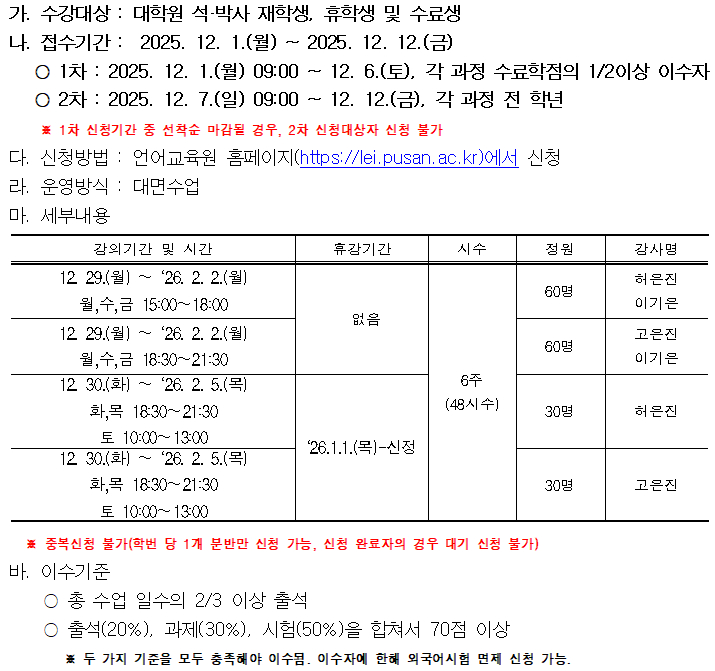 2025 겨울 대학원 학위청구 외국어시험 대체강좌 수강생 모집