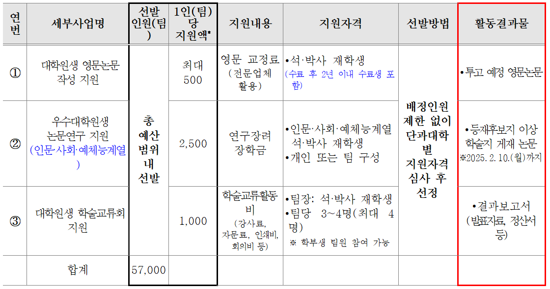 ※ 단과대학별 선발인원 제한은 없으나, 최종 취합 후 총 예산 범위 내 조정될 수 있음