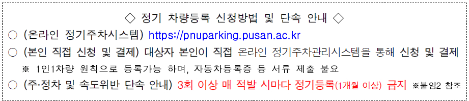 2026학년도 1학기 정기 차량등록 신청 방법을 다음과 같이 안내하오니, 대상자가 직접 주차신청을 할 수 있도록 적극 안내해주시기 바랍니다.