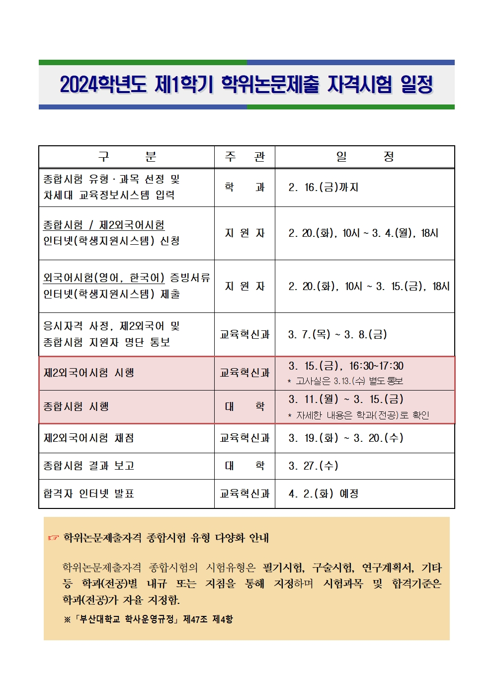 종합시험 | 3. 11.(월) ~ 3. 15.(금) | 대학에서 지정한 장소 | 응시자 전원 | 해당 대학장 |