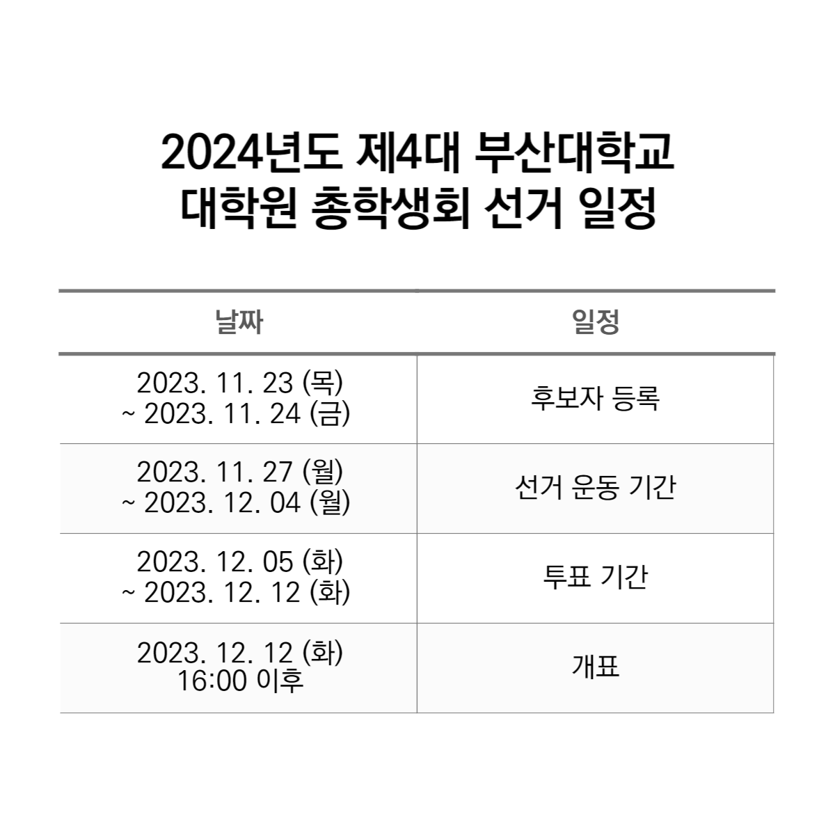 2024년도 제4대 부산대학교 대학원 총학생회 선거 일정을 공지합니다.