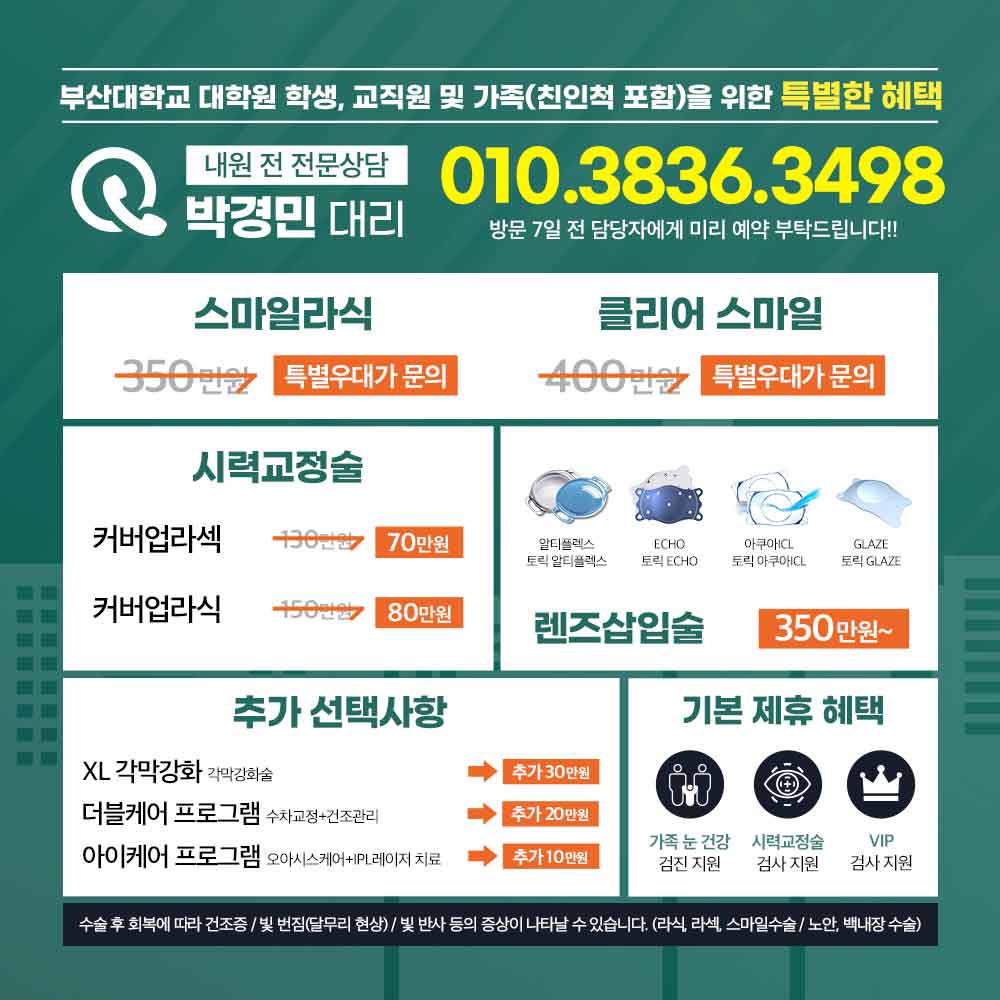 ▶ 최고등급 스마일 라식을 저렴하게 만나볼수 있는 부산대학교 대학원 소속 학생들만의 혜택