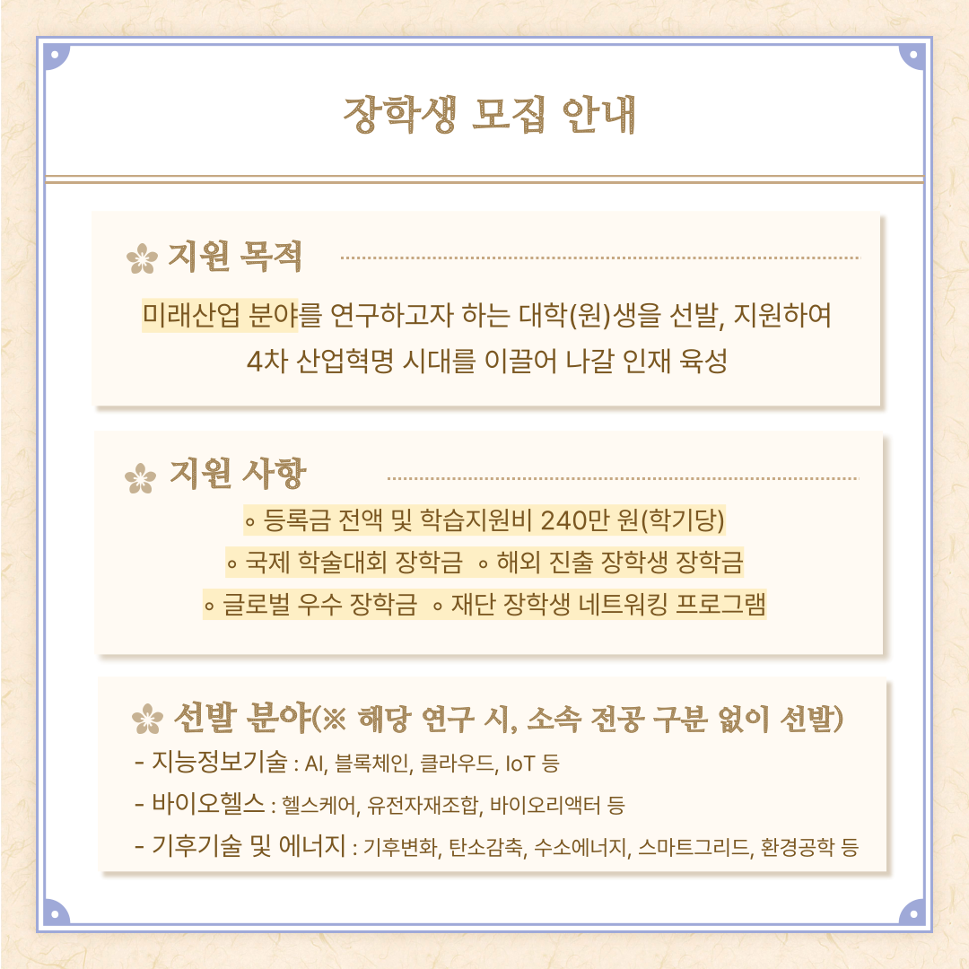 현대차 정몽구 재단에서 미래산업 스칼러십 장학생을 모집하고 있으니 관심있는 학생들의 많은 지원 바랍니다.