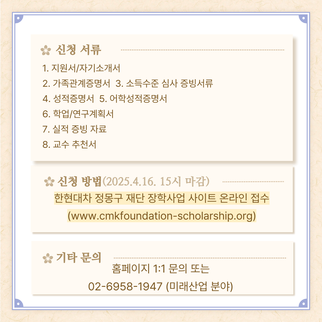 다. 접수방법: 현대차 정몽구 재단 장학사업 홈페이지(https://www.cmkfoundation-scholarship.org/) .