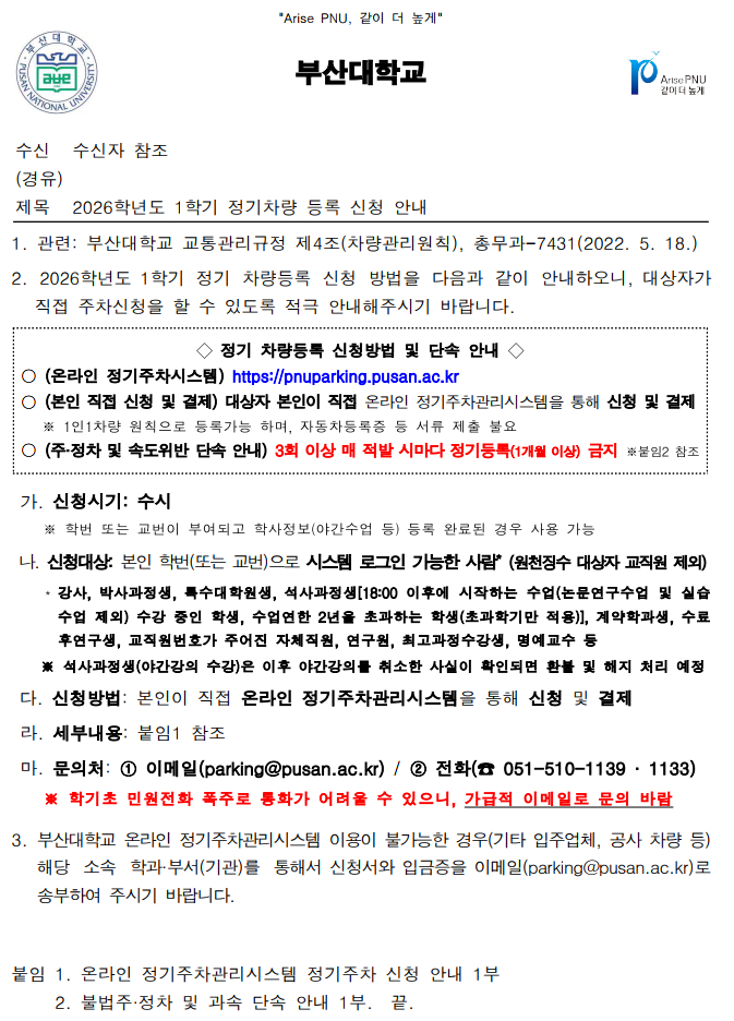 [2026학년도 1학기 정기차량 등록 신청 안내]