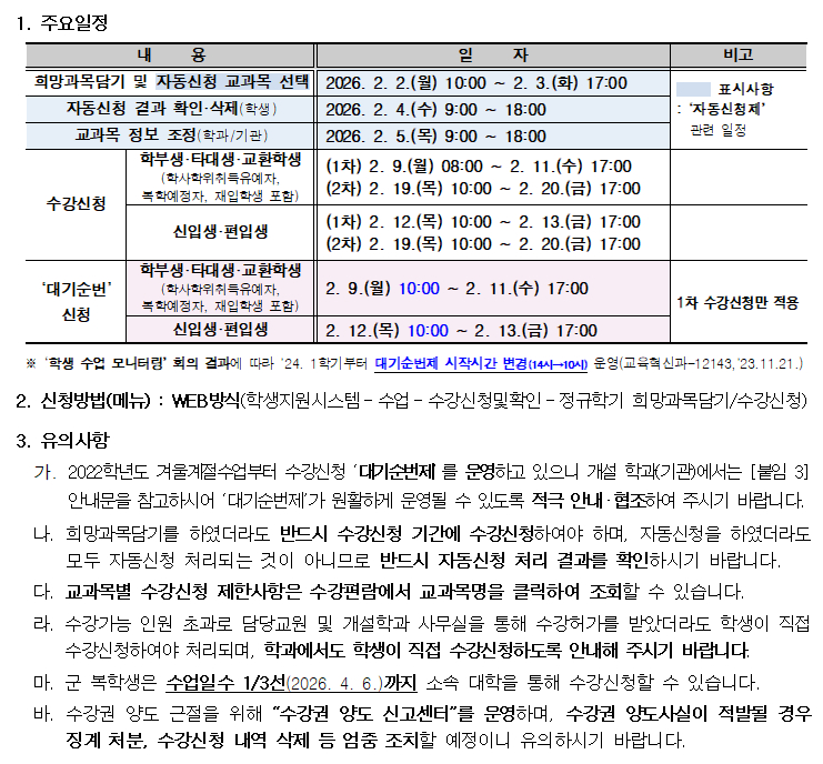 2026학년도 1학기 학부 희망과목담기 및 수강신청(대기순번제) 안내