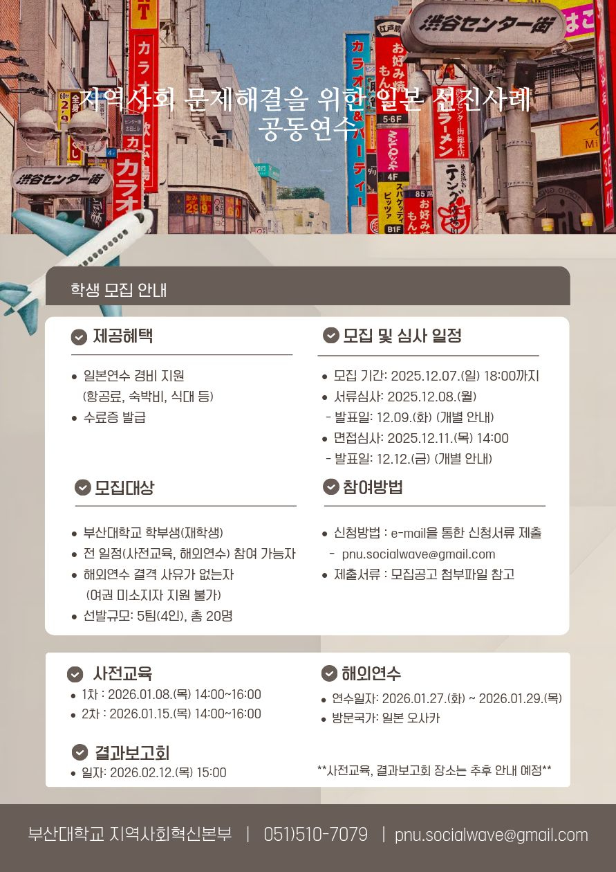 지역사회혁신본부에서는 부산형 지역혁신중심 대학지원체계(RISE) 사업의 「지역사회 문제해결을 위한 일본 선진사례 공동연수」를 운영하고자 하오니 학생들이 참여할 수 있도록 적극 홍보하여 주시기 바랍니다.
