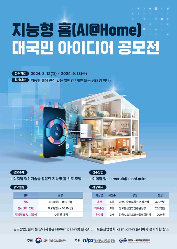 과학기술정보통신부, 정보통신산업진흥원과 한국AI스마트홈산업협회에서는 디지털 혁신 기술을 활용한 지능형 홈 선도모델 아이디어를 발굴하고자「지능형 홈(AI@Home) 대국민 아이디어 공모전」을 개최하오니 많은 관심과 참여 바랍니다.