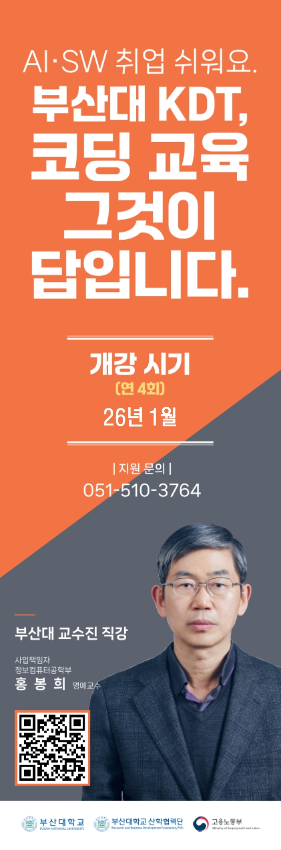 우리 부산대학교에서는 2022년 9월부터 시작된 K-디지털 트레이닝 "AI 활용 빅데이터분석 풀스택웹서비스 SW 개발자 양성과정"에 이어 2025년 1월부터는 과정명만 변경하여 "AI 데이터 분석 풀스택 웹 개발자 양성과정"으로 AI + 데이터분석 + Full Stack 웹 SW 개발자 양성을 위한 교육생을 다음과 같이 모집합니다.