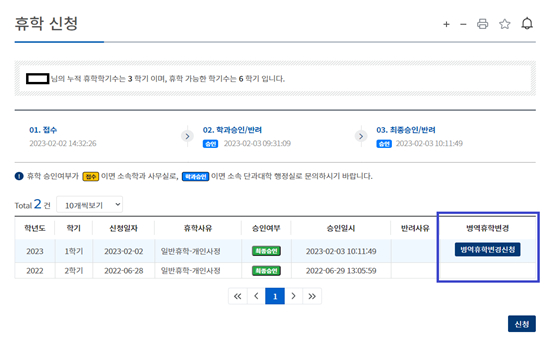 ① 휴학신청 목록 오른쪽에 [병역휴학변경신청] 버튼 제공