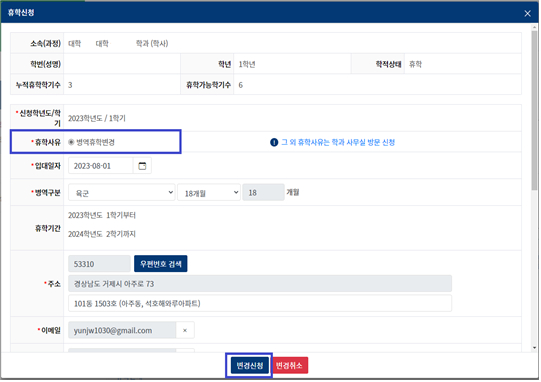 - 병역휴학의 학적변동일자는 일반휴학의 학적변동일자와 동일