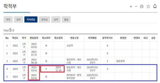 ① 당해학년도 학기의 병역휴학내역이 생성되며, 기존 일반휴학은 취소 처리