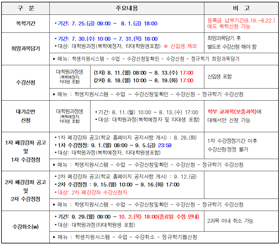 2025학년도 2학기 대학원과정 희망과목담기 및 수강신청 안내